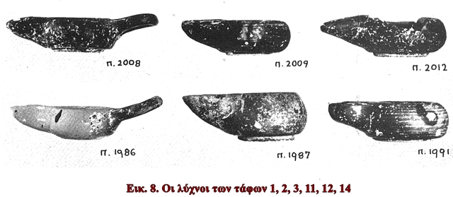 8. (Π.1986) (εικ.7 και 8). Λύχνος μετά λαβής, ακέραιος, εξ ερυθρωπού πηλού. Πρβλ. τύπον 23 Α Αγοράς, Agora IV, πίν.36, αρ.209 (-430/ - 375). Εις τον ιδικόν μας ο μυκτήρ περισσότερον επιμήκης και η λαβή σχεδόν τριγωνική.