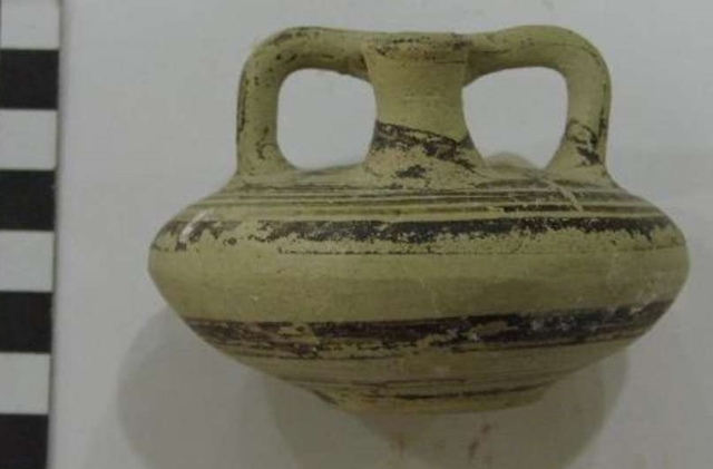 Μικύλλη χειροποίητη πρόχους, συγκολλημένη σε τμήματα του λαιμού, του χείλους και της λαβής (ΑΕ 6934). Σώμα σχετικά σφαιρικό. Λαιμός βραχύς, χείλος απλό έξω νεύον. Λαβή κάθετη επίπεδη. Βάση επίπεδη, ελαφρώς υπερυψωμένη. Στην επιφάνεια του αγγείου ίχνη καστανής βαφής. Munsell αλειφώματος 10YR 8/3. Ύψος 0.065μ., διάμ. σώματος 0.056μ., διάμ. στομίου 0.033μ., διάμ. βάσης 0.038μ.ΥΕ ΙΙΙΒ1 (Mountjoy 1994, 109, εικ.123).