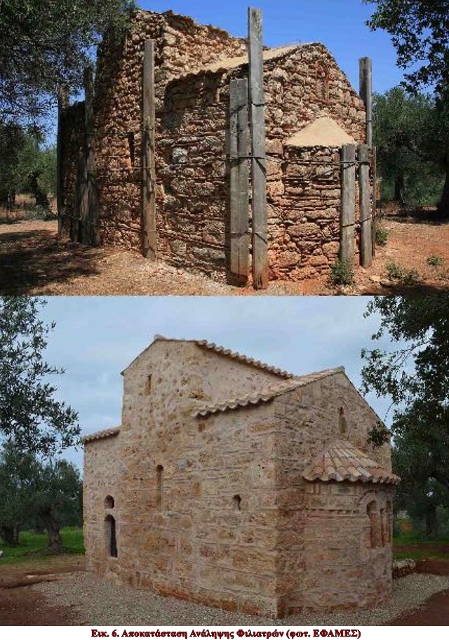 Ο μικρός σταυρεπίστεγος ναός της Ανάληψης Φιλιατρών11, του 13ου αι., που επίσης αντιμετώπιζε πολύ σοβαρά στατικά προβλήματα, αποκατάσταθηκε και συντηρήθηκε στο σύνολό του, με συνολική δαπάνη 105.000€ (εικ.6).