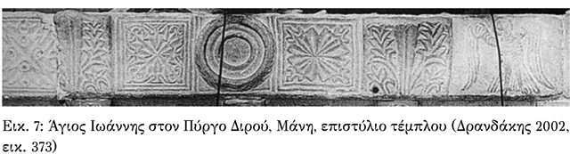 Ακόμη περισσότερο υποχωρεί η ποιότητα στο επιστύλιο του τέμπλου του ναού του Αγίου Ιωάννη στον Πύργο Διρού15 (εικ. 7), το οποίο χρονολογείται επίσης στον 12ο αιώνα.16 Εδώ ο διάκοσμος παρατίθεται σε τετράγωνα διάχωρα που δεν συνδέονται μεταξύ τους. Τα θέματα αποδίδονται εναλλάξ σε χαμηλό και έξεργο ανάγλυφο, με το τελευταίο να μην εξέχει ιδιαίτερα από την επιφάνεια του λίθου. Η σχηματοποίηση και η αδεξιότητα κυριαρχούν στην εκτέλεση. Ωστόσο, τόσο η γενική σύλληψη του διακόσμου, όσο και η επιλογή θεμάτων όπως η περιδινούμενη άκανθα και οι εξεζητημένοι σταυροί, μας επιτρέπουν να κατατάξουμε το επιστύλιο αυτό στον κύκλο των έργων που εμπνέονται από τον ναό των Χριστιάνων.