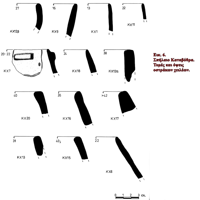 7 Μαρινᾶτος 1955, 246. Βλ. και ένδειξη σε πινακίδα, συνοδεύουσα το σύνολο των οστράκων: «Καταβόθρα Χώρας. Κατώτατον στρῶμα. Ἀριστερά τῆς εἰσόδου. 19/20-7-1955» (εικ. 4). Ορισμένα εξ αυτών είχαν ξεχωρισθεί από κάποιον, κατά το παρελθόν, με την ένδειξη «Selected».
