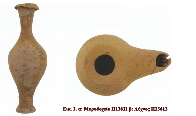 Το μυροδοχείο Π13611 (εικ. 3α) έχει ύψος 0,099μ. και χρονολογείται στον ύστερο 4ο ή στις απαρχές του -3ου αι.[3] Ο τύπος του λύχνου (Π13612) απαντάται συχνά στην ευρύτερη περιοχή και πιθανόν χρονολογείται στο α΄ τέταρτο του -3ο αι. (εικ. 3β)[4]
